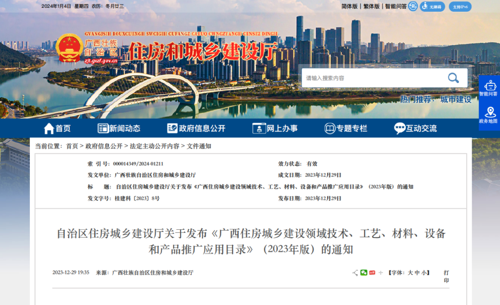 自治区住房城乡建设厅关于发布《广西住房城乡建设领域技术、工艺、材料、设备和产品推广应用目录》(2023年版)的通知