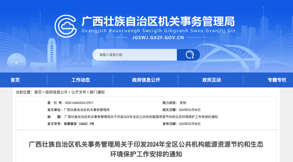 广西壮族自治区机关事务管理局关于印发《2024年全区公共机构能源资源节约和生态环境保护工作安排》的通知
